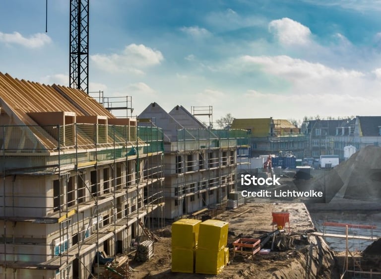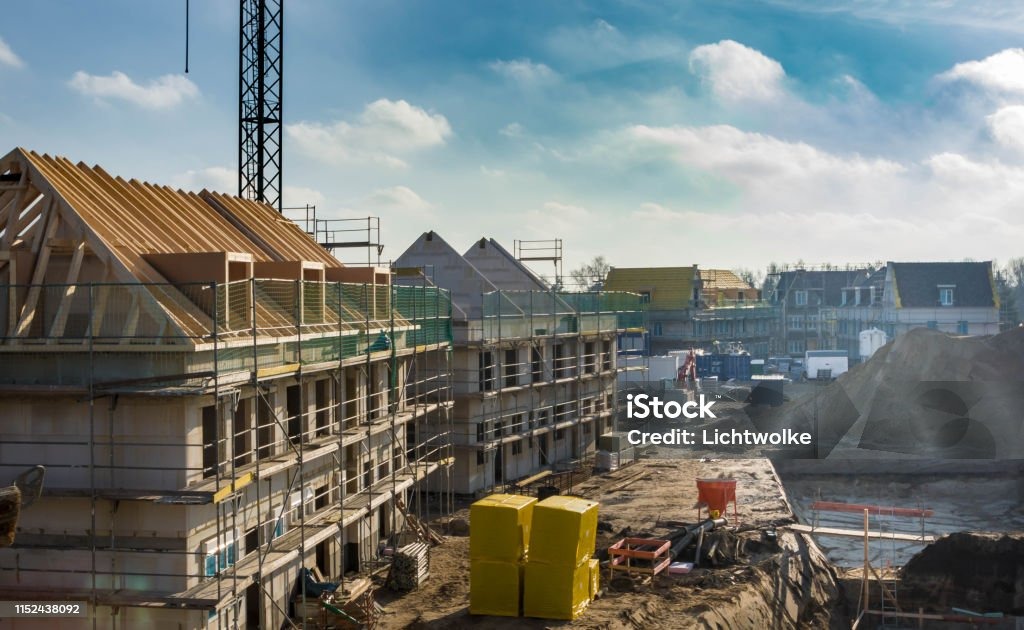 construction workers on a building site wearing helmets and safety gear, working actively, realistic, no text